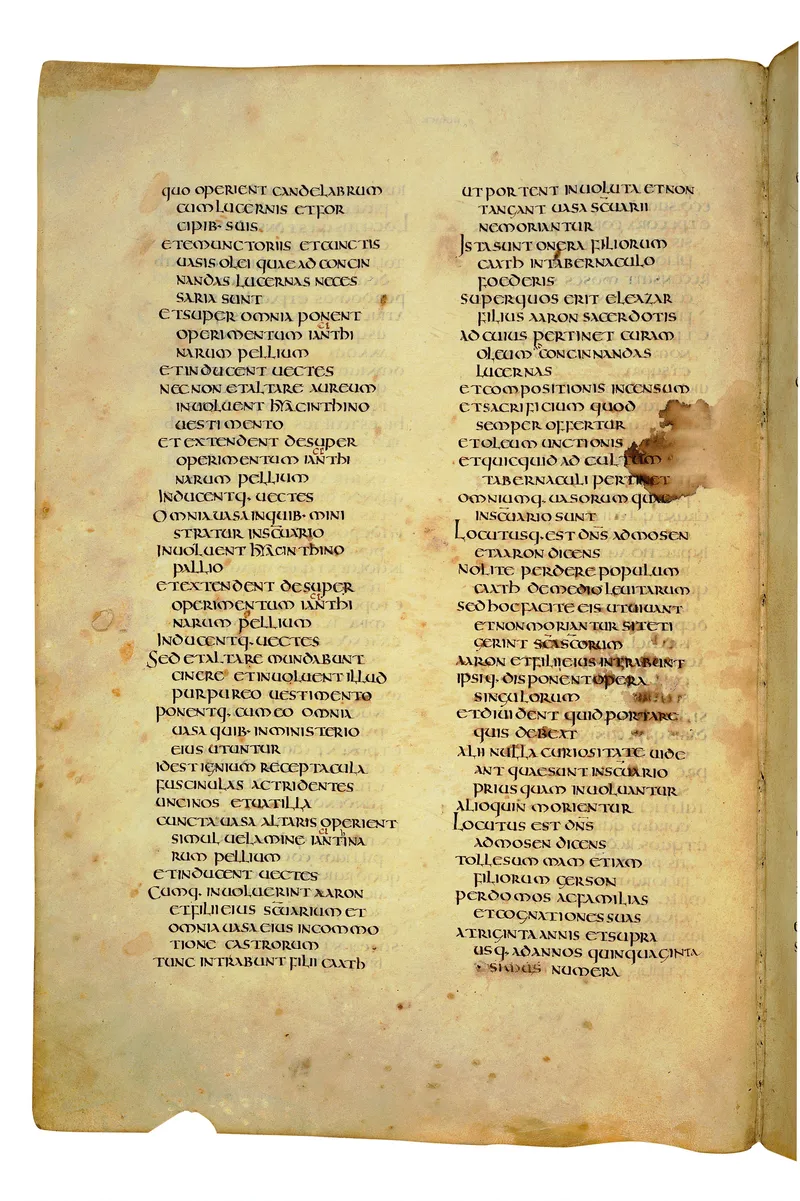Folio of the Codex Amiatinus, the oldest surviving complete Latin Vulgate manuscript, made c. 700 AD at the twin Northumbrian monasteries of Monkwearmouth and Jarrow under Abbot Ceolfrith. Approximately corresponds to Numbers 29 in Vulgate book order. The page shows the actual eighth-century insular-uncial script as it would have been read by the monks who produced it for Pope Gregory II.