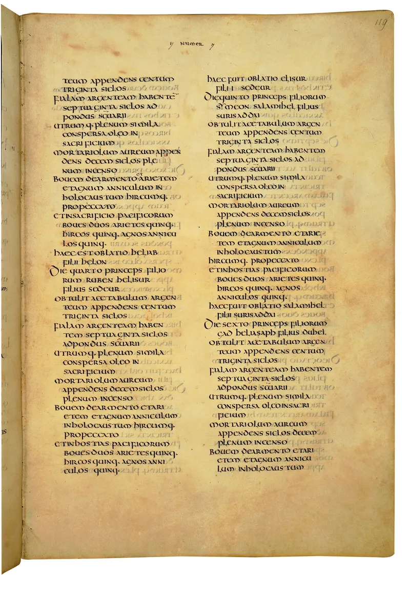 Folio of the Codex Amiatinus, the oldest surviving complete Latin Vulgate manuscript, made c. 700 AD at the twin Northumbrian monasteries of Monkwearmouth and Jarrow under Abbot Ceolfrith. Approximately corresponds to Numbers 33 in Vulgate book order. The page shows the actual eighth-century insular-uncial script as it would have been read by the monks who produced it for Pope Gregory II.