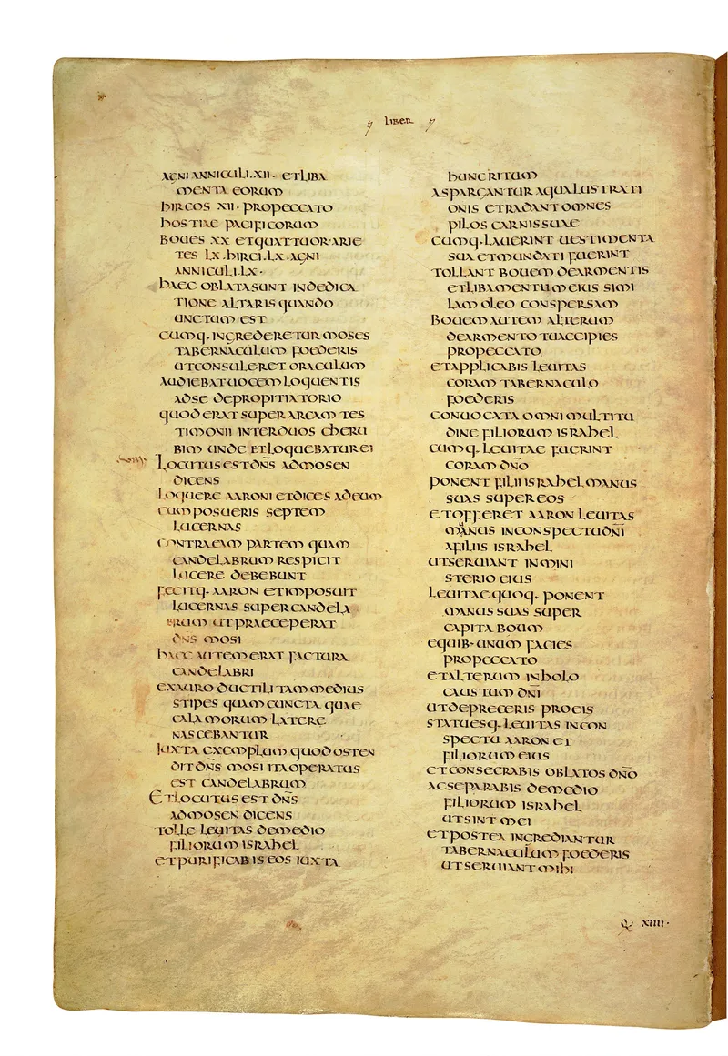 Folio of the Codex Amiatinus, the oldest surviving complete Latin Vulgate manuscript, made c. 700 AD at the twin Northumbrian monasteries of Monkwearmouth and Jarrow under Abbot Ceolfrith. Approximately corresponds to Numbers 35 in Vulgate book order. The page shows the actual eighth-century insular-uncial script as it would have been read by the monks who produced it for Pope Gregory II.