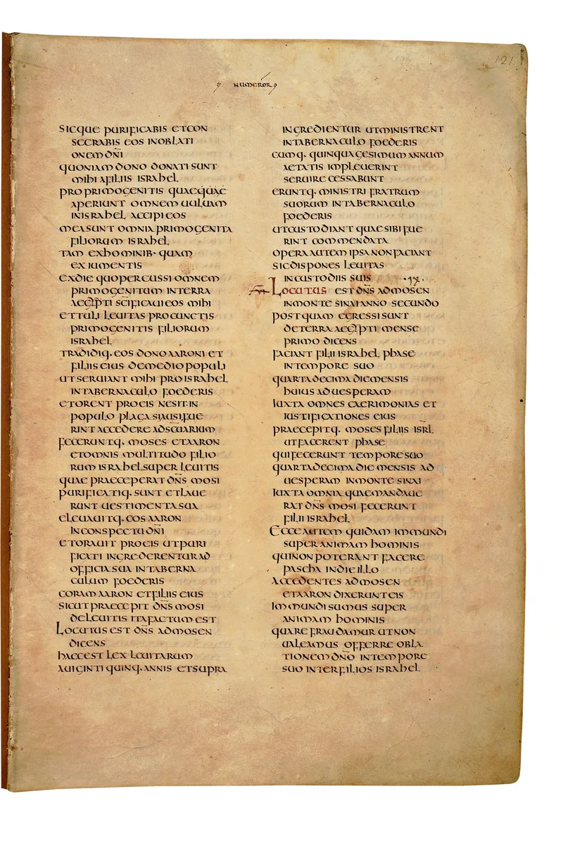 Folio of the Codex Amiatinus, the oldest surviving complete Latin Vulgate manuscript, made c. 700 AD at the twin Northumbrian monasteries of Monkwearmouth and Jarrow under Abbot Ceolfrith. Approximately corresponds to Numbers 36 in Vulgate book order. The page shows the actual eighth-century insular-uncial script as it would have been read by the monks who produced it for Pope Gregory II.