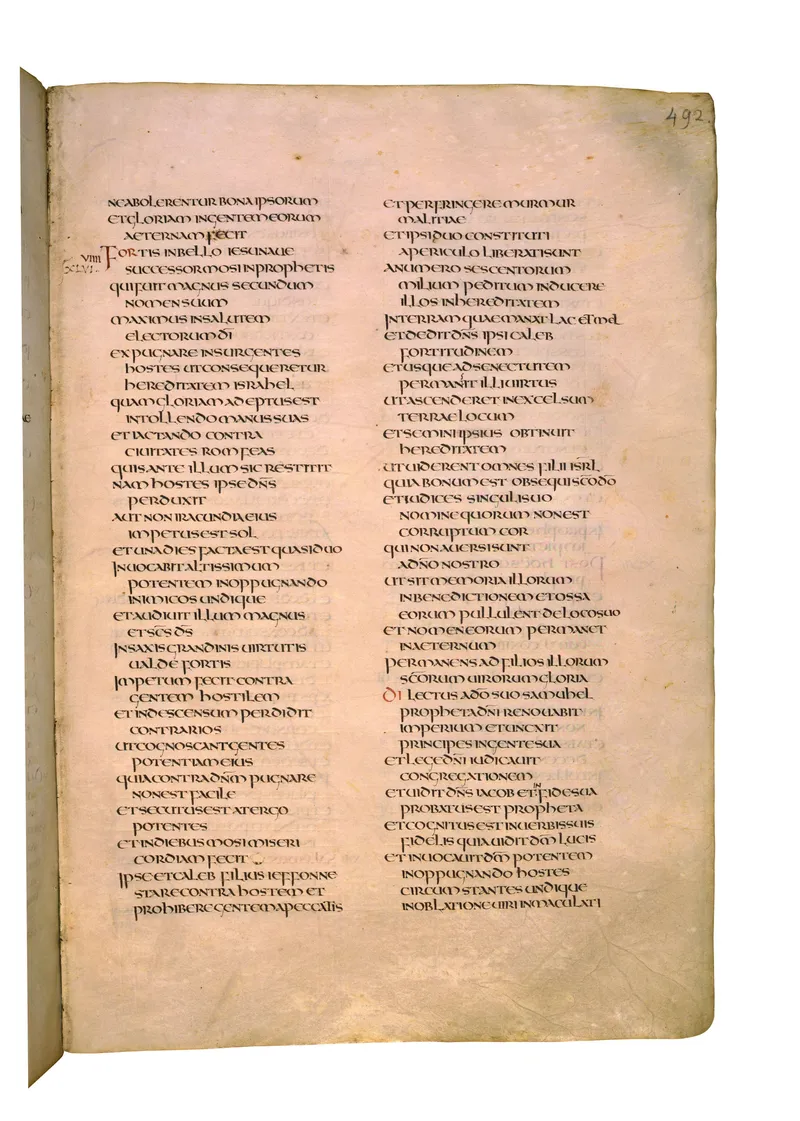 Folio of the Codex Amiatinus, the oldest surviving complete Latin Vulgate manuscript, made c. 700 AD at the twin Northumbrian monasteries of Monkwearmouth and Jarrow under Abbot Ceolfrith. Approximately corresponds to Psalms 124 in Vulgate book order. The page shows the actual eighth-century insular-uncial script as it would have been read by the monks who produced it for Pope Gregory II.