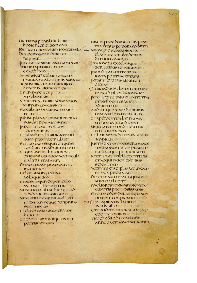 Folio of the Codex Amiatinus, the oldest surviving complete Latin Vulgate manuscript, made c. 700 AD at the twin Northumbrian monasteries of Monkwearmouth and Jarrow under Abbot Ceolfrith. Approximately corresponds to Psalms 35 in Vulgate book order. The page shows the actual eighth-century insular-uncial script as it would have been read by the monks who produced it for Pope Gregory II.