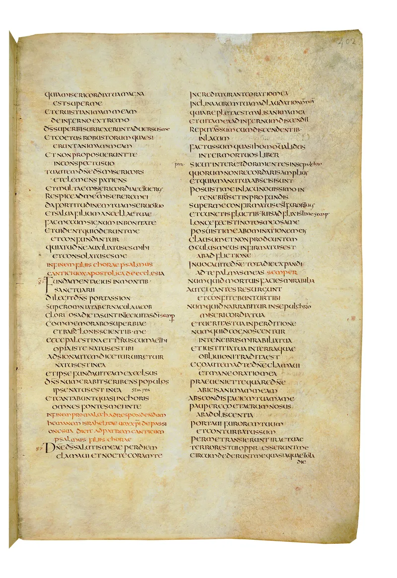 Folio of the Codex Amiatinus, the oldest surviving complete Latin Vulgate manuscript, made c. 700 AD at the twin Northumbrian monasteries of Monkwearmouth and Jarrow under Abbot Ceolfrith. Approximately corresponds to Psalms 8 in Vulgate book order. The page shows the actual eighth-century insular-uncial script as it would have been read by the monks who produced it for Pope Gregory II.
