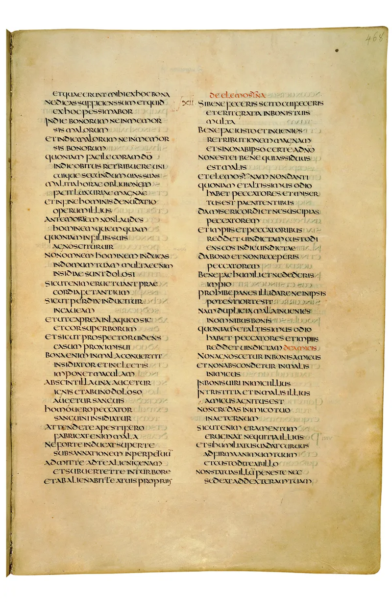 Folio of the Codex Amiatinus, the oldest surviving complete Latin Vulgate manuscript, made c. 700 AD at the twin Northumbrian monasteries of Monkwearmouth and Jarrow under Abbot Ceolfrith. Approximately corresponds to Psalms 93 in Vulgate book order. The page shows the actual eighth-century insular-uncial script as it would have been read by the monks who produced it for Pope Gregory II.