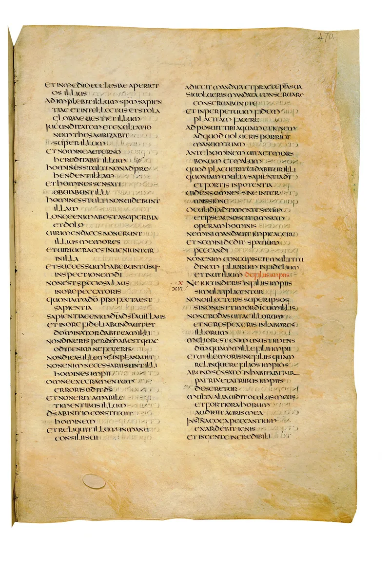 Folio of the Codex Amiatinus, the oldest surviving complete Latin Vulgate manuscript, made c. 700 AD at the twin Northumbrian monasteries of Monkwearmouth and Jarrow under Abbot Ceolfrith. Approximately corresponds to Psalms 96 in Vulgate book order. The page shows the actual eighth-century insular-uncial script as it would have been read by the monks who produced it for Pope Gregory II.