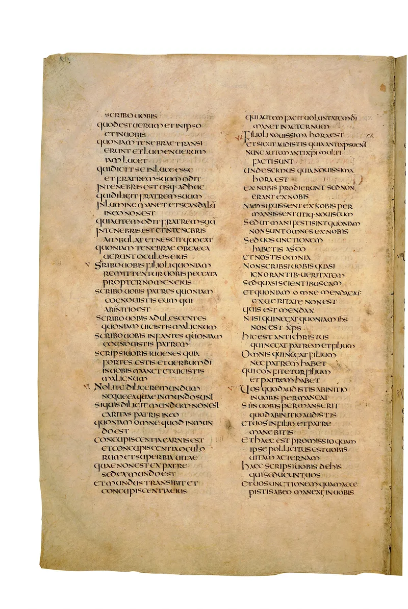 Folio of the Codex Amiatinus, the oldest surviving complete Latin Vulgate manuscript, made c. 700 AD at the twin Northumbrian monasteries of Monkwearmouth and Jarrow under Abbot Ceolfrith. Approximately corresponds to Revelation 1 in Vulgate book order. The page shows the actual eighth-century insular-uncial script as it would have been read by the monks who produced it for Pope Gregory II.