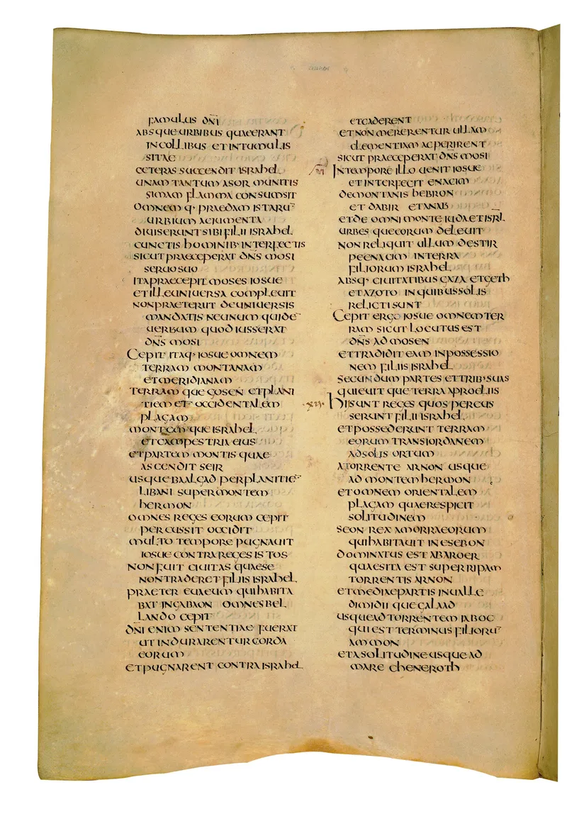 Folio of the Codex Amiatinus, the oldest surviving complete Latin Vulgate manuscript, made c. 700 AD at the twin Northumbrian monasteries of Monkwearmouth and Jarrow under Abbot Ceolfrith. Approximately corresponds to Ruth 3 in Vulgate book order. The page shows the actual eighth-century insular-uncial script as it would have been read by the monks who produced it for Pope Gregory II.