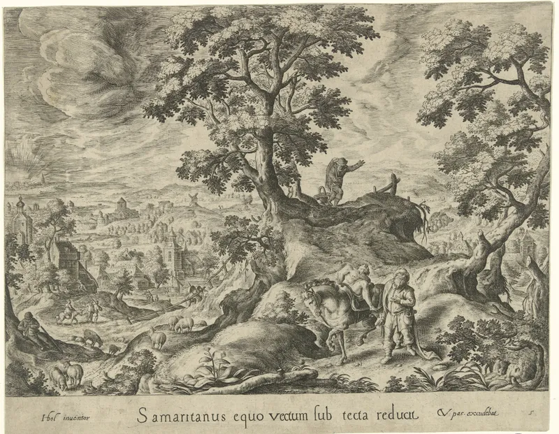 Landschappen met scènes uit de gelijkenis van de barmhartige Samaritaan