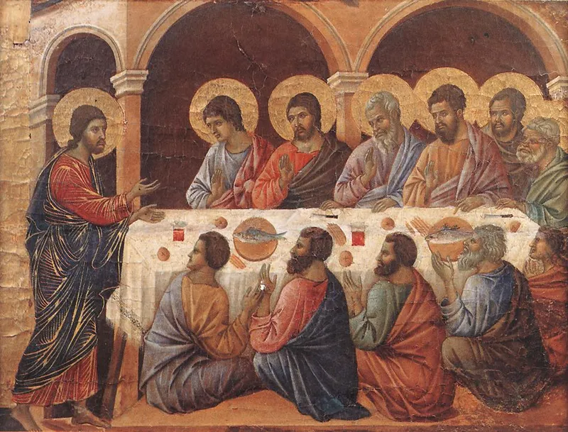 Duccio di Buoninsegna was the founder of the Sienese school and author of the Maestà (1308–1311), the altarpiece of Siena Cathedral. Its central Madonna in Majesty and roughly fifty small narrative panels — Infancy, Ministry, Passion, Resurrection appearances, and Life of the Virgin — form one of the most complete visual gospels of the Middle Ages.