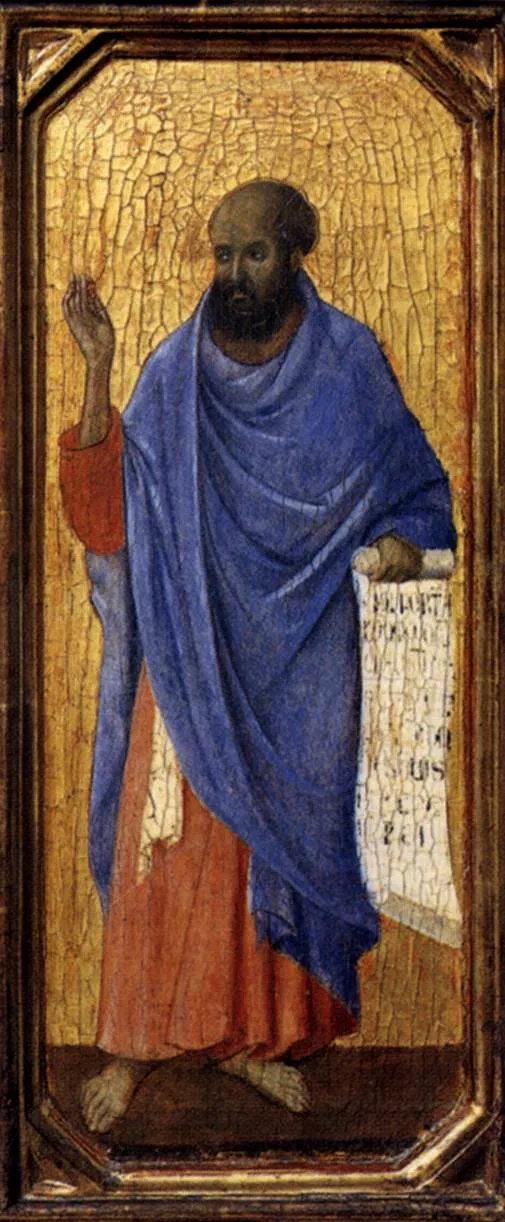 Duccio di Buoninsegna was the founder of the Sienese school and author of the Maestà (1308–1311), the altarpiece of Siena Cathedral. Its central Madonna in Majesty and roughly fifty small narrative panels — Infancy, Ministry, Passion, Resurrection appearances, and Life of the Virgin — form one of the most complete visual gospels of the Middle Ages.