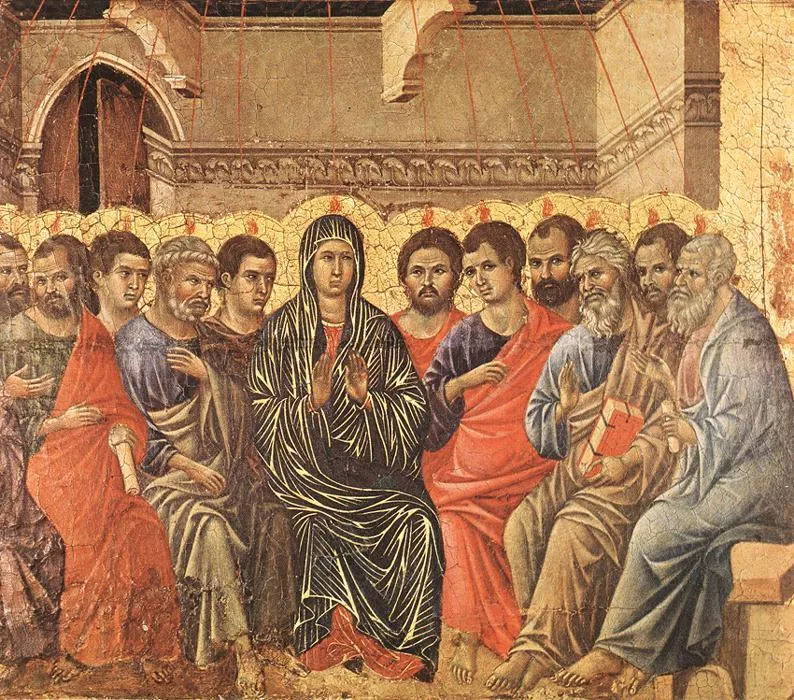 Duccio di Buoninsegna was the founder of the Sienese school and author of the Maestà (1308–1311), the altarpiece of Siena Cathedral. Its central Madonna in Majesty and roughly fifty small narrative panels — Infancy, Ministry, Passion, Resurrection appearances, and Life of the Virgin — form one of the most complete visual gospels of the Middle Ages.