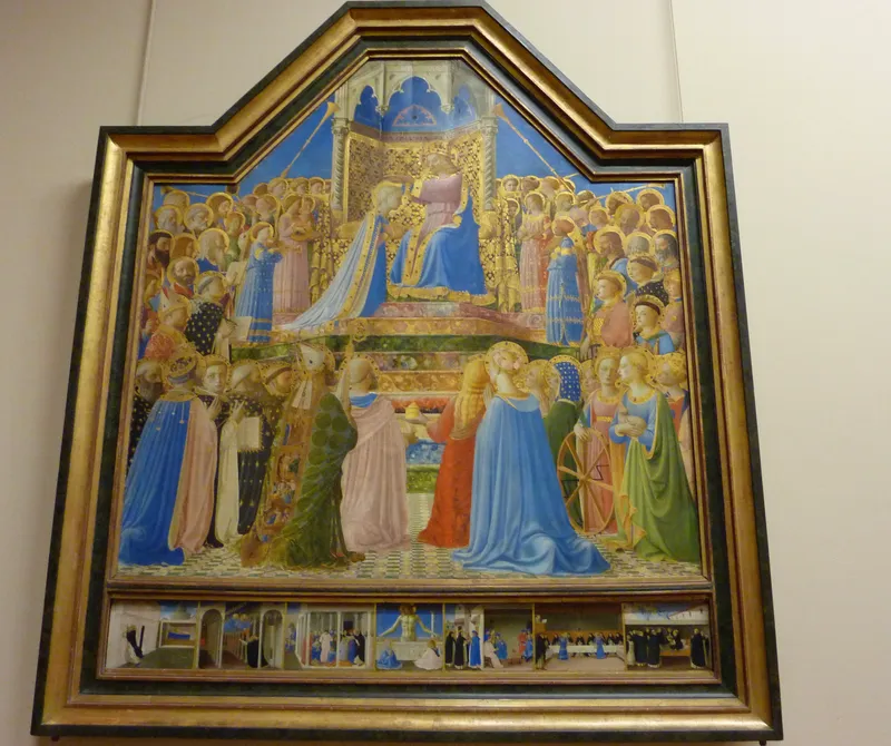 Originally for the high altar of San Domenico, Fiesole. Christ crowns the Virgin on a step pyramid of clouds, surrounded by saints and angels. Musée du Louvre, Paris.