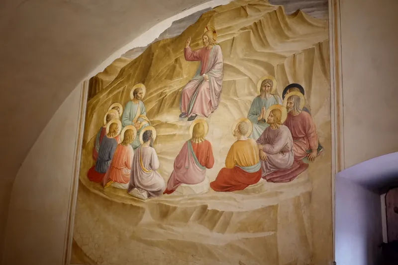 San Marco cell fresco. Christ teaches the Beatitudes seated on the slope; the disciples attend in a semicircle. Convent of San Marco, Florence.