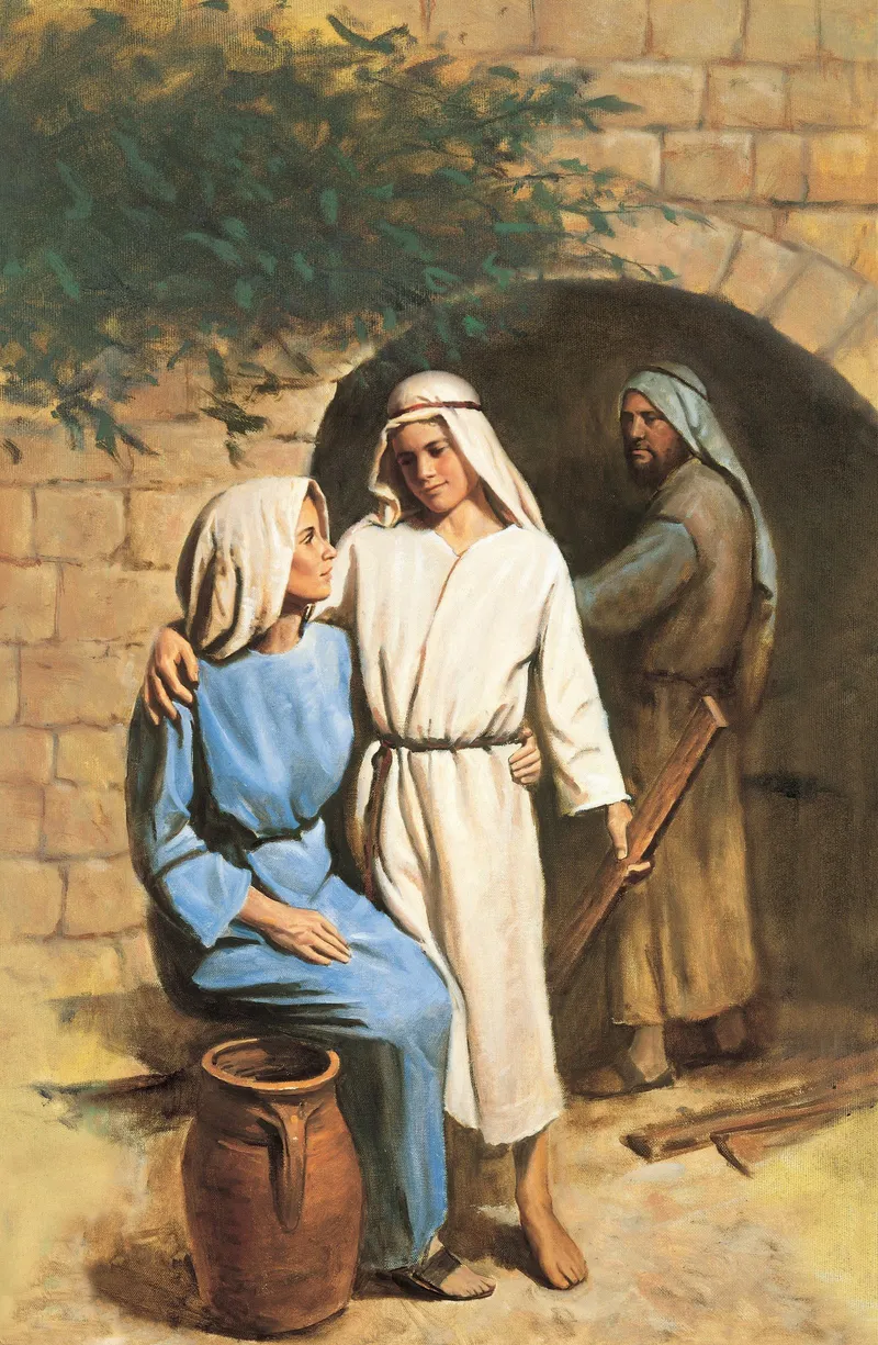 Young Jesus in white robes, standing next to His mother, Mary, and putting His arm around her while Joseph looks on in the background.
