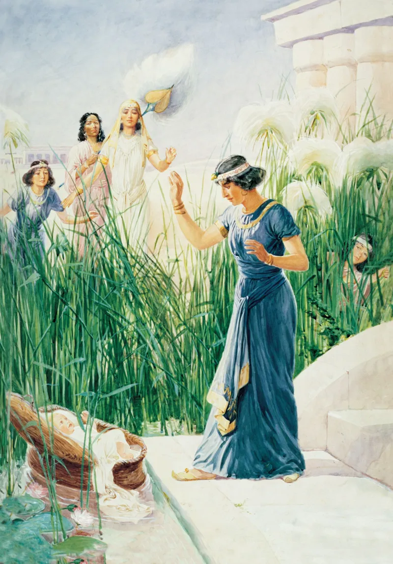 A painting by George Soper showing the daughter of Pharaoh and several other women encountering the baby Moses among the bulrushes.