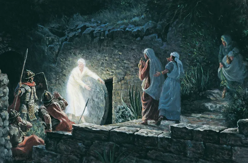 Three women watch an angel in white clothing rolling the stone away from the tomb while Roman soldiers look on in fear.