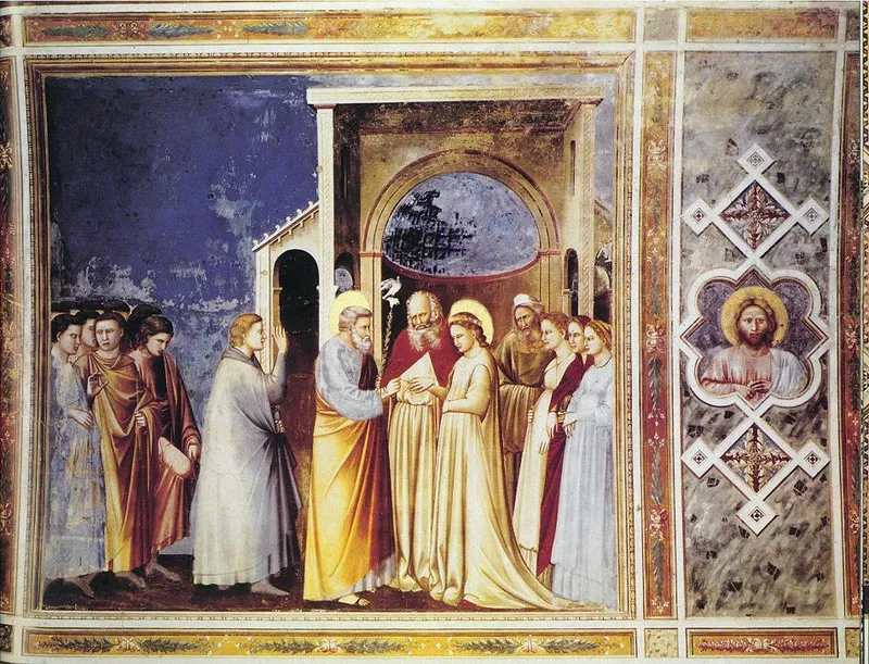 Scrovegni Chapel, scene 11. Joseph, whose rod has flowered, is wed to Mary before the high priest.