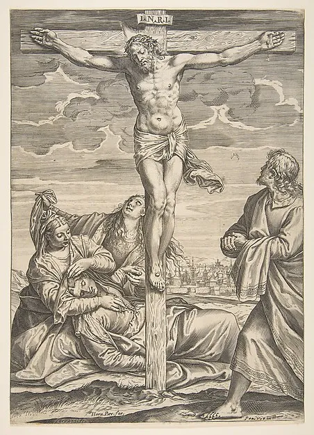 Christ on the cross, Saint John to the right looking toward him, to the left is the fainting Virgin Mary supported by two women