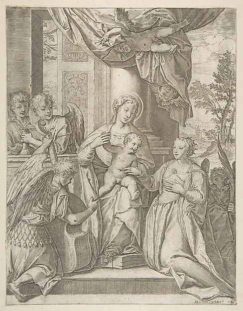 The mystic marriage of Saint Catherine who sits at center with the Christ child, angels with instruments at the left