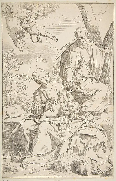 Rest on the flight into Egypt, Mary holding the infant Christ while St. Joseph hands him a fruit