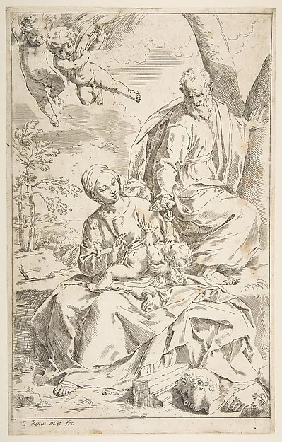 Rest on the flight into Egypt, Mary holding the infant Christ while St. Joseph hands him a fruit