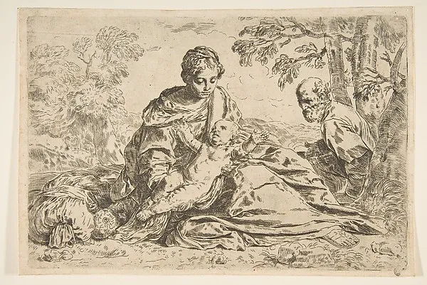 Rest on the flight into Egypt, Mary holding the infant Christ with St. Joseph at right, copy after Cantarini