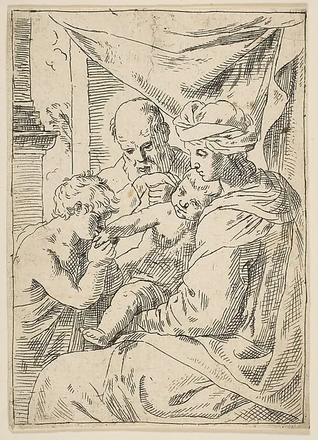 Holy Family with Saint John the Baptist kissing the infant Christ's hand, copy in reverse after Cantarini
