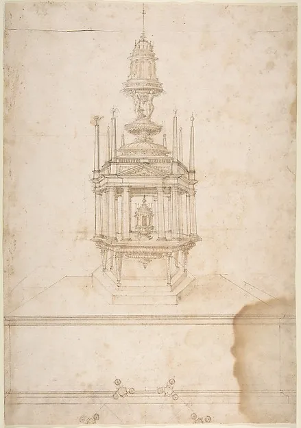 Design for an Polygonal Tabernacle, with Obelisks and a Pediment Surmounted by Three Figures Supporting a Tempietto-like Structure