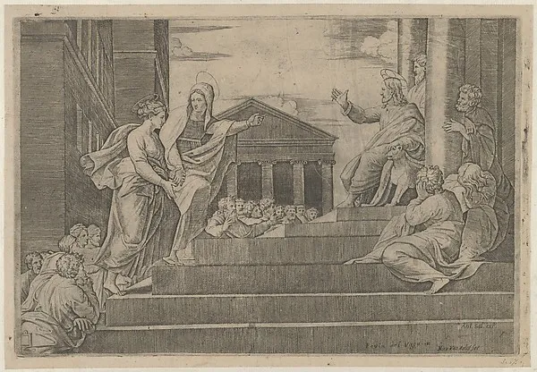 Martha leading Mary Magdalene up a flight of stairs to Christ who is seated at right at the entrance to a temple