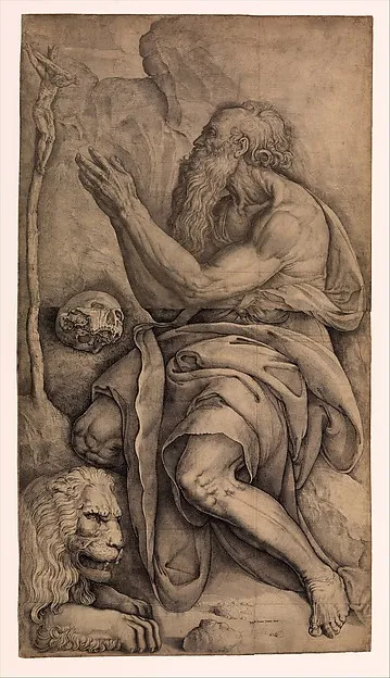 Saint Jerome kneeling before a crucifix, with a skull and lion