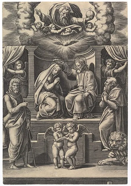The Coronation of the Virgin, at lower left stands St John the Baptist, at lower right St Jerome, God the father above