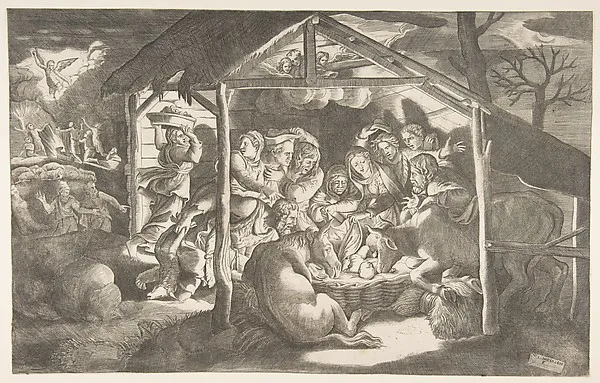 The adoration of the shepherds, various figures at night surround the Christ Child