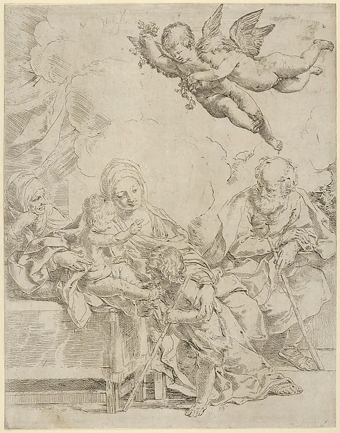 The Holy Family with young John the Baptist and Saint Elizabeth, two angels above