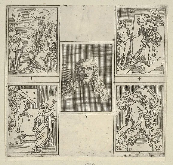 Five numbered scenes, each after a painter in the Accademia Degl'Incamminati, from IL FUNERALE D'AGOSTINO CARRACCIO FATTO IN BOLOGNA SUA PATRIA DAGL'INCAMINATI Academici del Disegno: 1. Painting and Poetry mourning the death of Agostino Carracci, painted by Francesco Brizio; 2. Painting with a lyre and Apollo pointing to stars on Carracci's grave, design by Giacomo Cavedone; 3. The head of Christ, painted by Agostino Carracci; 4. Prometheus with a torch and Athena behind him, painted by Alessandro Albini; 5. Aurora abducting Cephalus, painted by Leonello Spada.