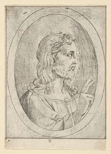 Christ seen in profile facing right, making the sign of blessing with his right hand, in an oval frame, from "Christ, the Virgin, and Thirteen Apostles"