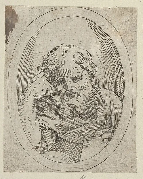An apostle resting his head on his right hand and holding a book, in an oval frame, from "Christ, the Virgin, and Thirteen Apostles"