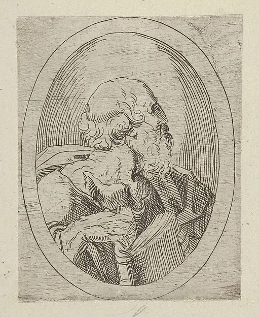 An apostle seen in profile facing right, holding an open book, in an oval frame, from "Christ, the Virgin, and Thirteen Apostles"