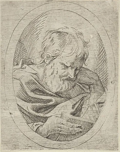 An apostle resting his head on his left hand and reading a book, in an oval frame, from "Christ, the Virgin, and Thirteen Apostles"