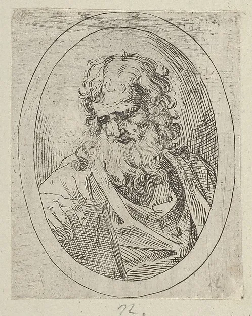 An apostle with a long beard looking down at an open book, in an oval frame, from "Christ, the Virgin, and Thirteen Apostles"