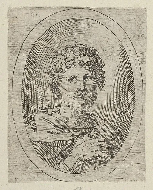 An apostle with a short beard holding a closed book, from "Christ, the Virgin, and Thirteen Apostles"