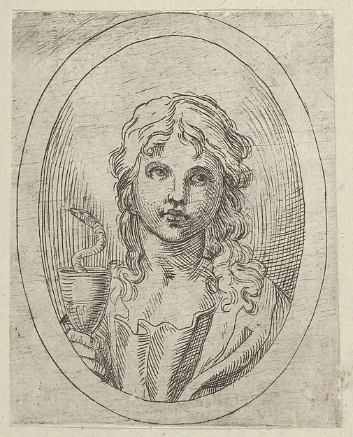Saint John the Evangelist holding a goblet with a snake emerging from it, from "Christ, the Virgin, and Thirteen Apostles"