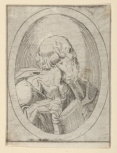 An apostle seen in profile facing right, holding an open book, in an oval frame, from "Christ, the Virgin, and Thirteen Apostles"