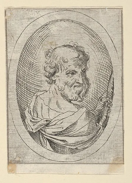Saint Simon seen from behind, turning to the right and holding a saw, in an oval frame, from "Christ, the Virgin, and Thirteen Apostles"