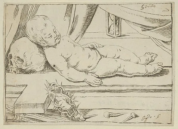 The infant Christ asleep on a cross, his head resting on a skull, a crown of thorns and nails in the foreground