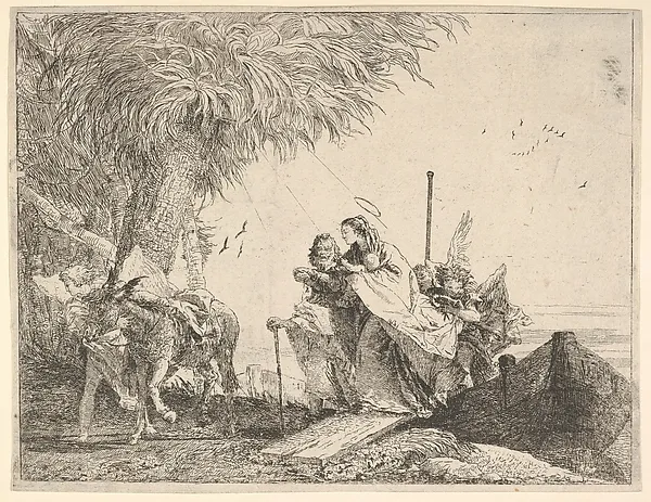 Mary, helped by Joseph and an angel, stepping from a boat to the shore, an angel steadies a donkey before her, from "The Flight into Egypt"