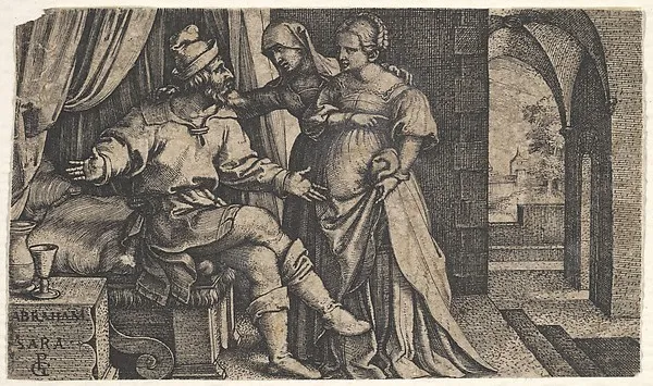 Sarah presenting Hagar to Abraham, who sits at the foot of a bed, from "The Story of Abraham"