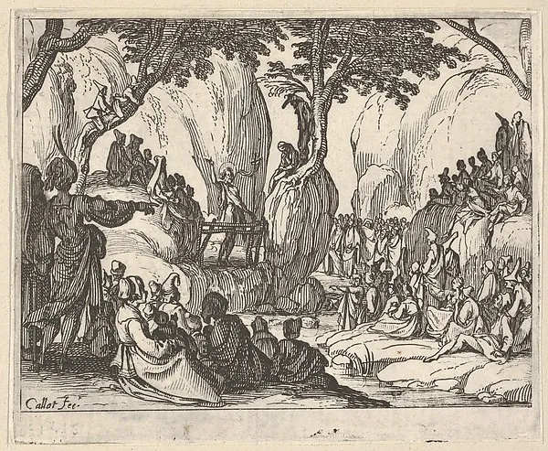 Saint John Preaching in the Desert (Saint Jean Préchant dans le Désert), with arm upraised, surrounded by male and female figures in a rocky setting