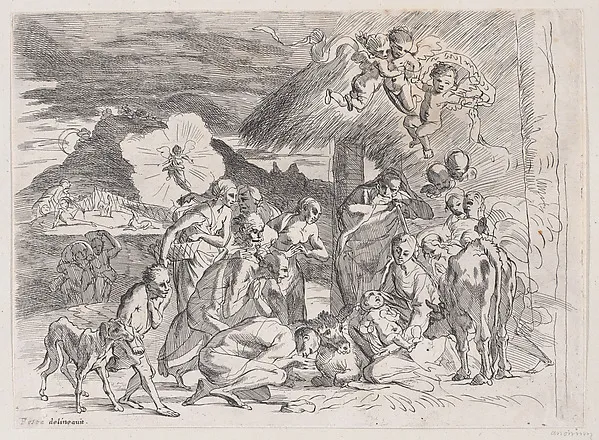 The adoration of the shepherds who gather at left, angels holding a banderole upper right