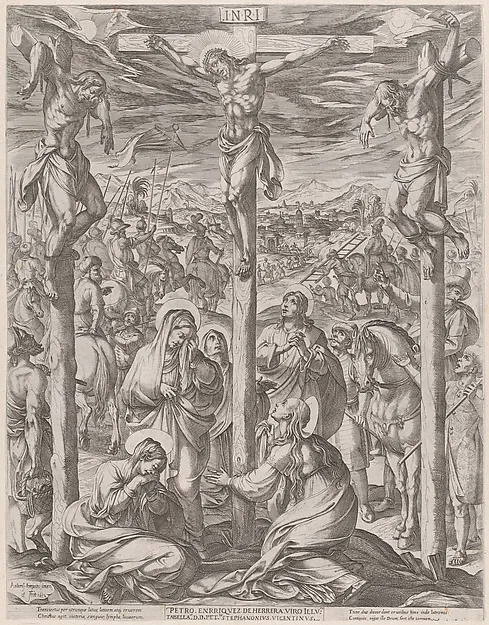 Christ crucified between the two thieves, the three maries at the foot of the cross