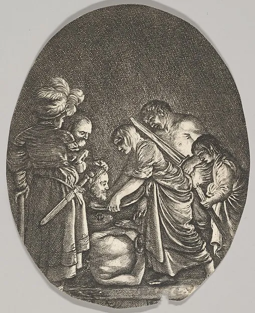 Salome receiving the head of John the Baptist, surrounded by three men and a child bearing a torch, the Baptist's body lies on the ground